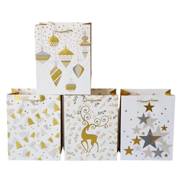 Świąteczna torebka prezentowa wykonana z trwałego papieru, utrzymana w klasycznej, eleganckiej stylistyce. Idealna do zapakowania prezentów pod choinkę, nadaje upominkom wyjątkowy, odświętny charakter. Wyposażona w mocne uchwyty i staranne wykończenie, łączy estetykę z praktycznością.