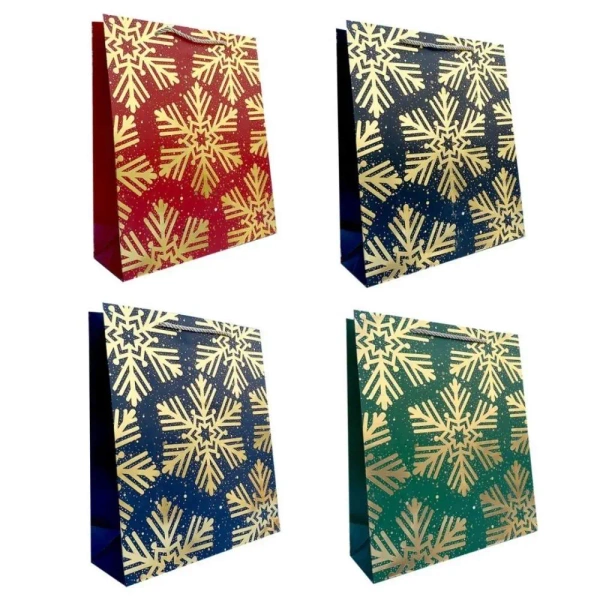 Świąteczna torebka prezentowa wykonana z trwałego papieru, utrzymana w klasycznej, eleganckiej stylistyce. Idealna do zapakowania prezentów pod choinkę, nadaje upominkom wyjątkowy, odświętny charakter. Wyposażona w mocne uchwyty i staranne wykończenie, łączy estetykę z praktycznością.