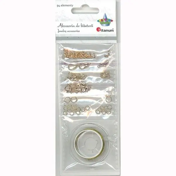 50 zacisków o2 mm, 3 zapięcia 14 mm, 10 zapięć 12 mm, 5 zapięć 10 mm, 5 ringów o6 mm, 20 ringów o5 mm, 1 drucik 3 m