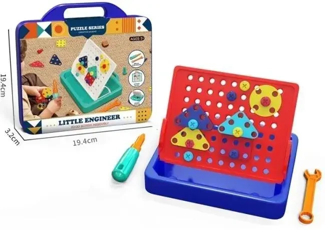 Rozwijaj kreatywność i umiejętności techniczne swojego dziecka z zestawem Mały Inżynier. To edukacyjna mozaika śrubowa 2D/3D z serii Puzzle Series, zaprojektowana z myślą o maluchach od 3 roku życia. Zestaw składa się z solidnej, czerwono-niebieskiej tablicy z perforacją, którą można ustawić pod kątem w podstawce pełniącej funkcję pojemnika na elementy. Dziecko ma do dyspozycji kolorowe, geometryczne kształty z otworami, a także plastikowe śruby, które mocuje do tablicy za pomocą dołączonego wkrętaka i klucza. Ta wciągająca zabawa w montowanie i demontowanie nie tylko dostarcza rozrywki, ale przede wszystkim wspomaga rozwój motoryki małej, precyzji ruchów oraz uczy podstaw inżynierii i logicznego myślenia. Dzięki różnorodnym kształtom i kolorom, dziecko może tworzyć niepowtarzalne płaskie lub przestrzenne konstrukcje i wzory. Kompaktowe wymiary opakowania (ok. 19,4 x 19,4 x 3,2 cm) sprawiają, że zestaw jest łatwy do przechowywania i idealny do zabrania w podróż. Wszystkie elementy są bezpieczne i dostosowane do małych rączek. W zestawie znajdują się: tablica montażowa, podstawka/pojemnik, śruby, kolorowe elementy mozaiki, wkrętak oraz klucz.