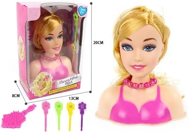 Przygotuj się na godziny kreatywnej zabawy z głową lalki Beautiful Girl do stylizacji włosów. Ta zabawka to świetny sposób, aby małe stylistki mogły ćwiczyć swoje umiejętności fryzjerskie i makijażowe. Lalka ma piękne, długie blond włosy, które można czesać, zaplatać i upinać na wiele różnych sposobów. Głowa jest osadzona na różowym torsie i ozdobiona modnym, różowym naszyjnikiem z koralików. W zestawie oprócz samej głowy do stylizacji znajdziesz również akcesoria: różową szczotkę do włosów oraz cztery kolorowe spinki w kształcie kwiatków (różową, żółtą, zieloną i fioletową), które urozmaicą każdą fryzurę. Całość zapakowana jest w estetyczne, różowe pudełko z okienkiem. Wysokość głowy to około 20 cm, co zapewnia wygodę podczas zabawy. Wymiary opakowania: 13 cm szerokości i 8 cm głębokości. Produkt polecany jest dla dzieci powyżej 3 roku życia. Ta zabawka to doskonały pomysł na prezent, który rozwija wyobraźnię, precyzję i zdolności artystyczne dziecka.