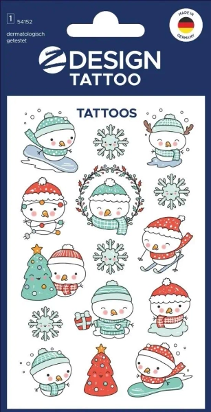 Poczuj magię świąt z tatuażami Z-Design! To idealny drobiazg do kalendarza adwentowego, prezentu od Mikołaja lub małej niespodzianki pod choinkę. Kolorowe, radosne wzory wprowadzą świąteczny nastrój i wywołają uśmiech na twarzach najmłodszych. Aplikacja tatuaży jest szybka i prosta wystarczy wyciąć wzór, przyłożyć do skóry, zwilżyć i gotowe! Bezpieczne dla dzieci, testowane dermatologicznie i wyjątkowo delikatne dla skóry zapewnią kilka dni magicznej zabawy w świątecznym stylu! Dla dzieci pozyżej 3-go roku życia