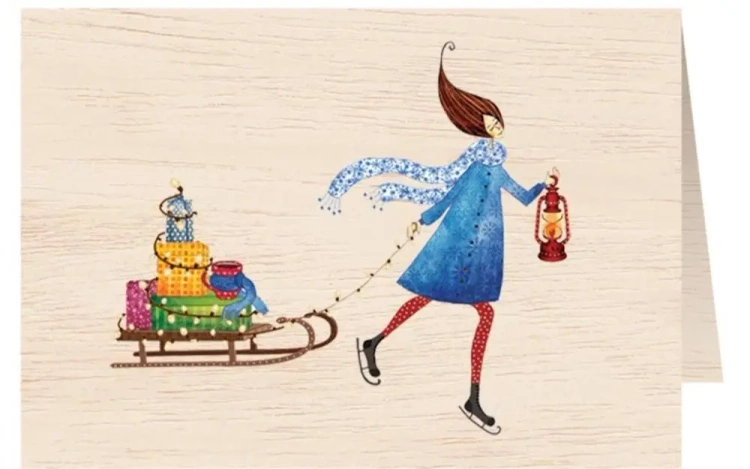 Karnet drewniany C6 + koperta Święta Kobieta Sanki - Cozywood