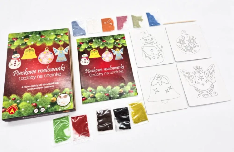 „Piaskowe Malowanki – Ozdoby na Choinkę” to zestaw, który zamienia dziecięcą wyobraźnię w prawdziwe, kolorowe dekoracje. W środku znajdziesz cztery wzory: aniołka, bombkę, dzwonek i uroczego bałwanka oraz 11 woreczków z kolorowym piaskiem. Wystarczy odkleić fragment samoprzylepnego obrazka i posypać go piaskiem, by stworzyć małe dzieło sztuki.