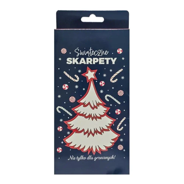 Skarpetki z motywem świątecznym w opakowaniu prezentowym.
