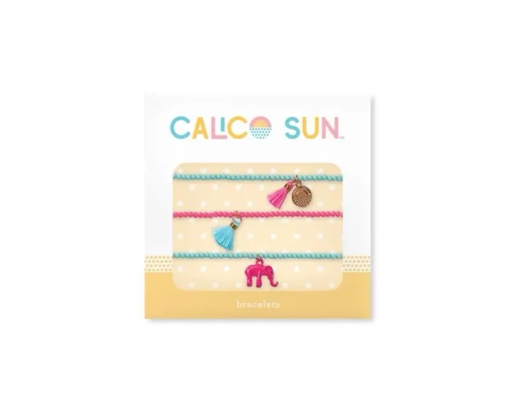 Trzy bransoletki z koralików w uzupełniających się odcieniach różu i mięty ozdobione są dopasowanymi kolorystycznie frędzelkami i złotą zawieszką Calico Sun, a przewodnim akcentem w tym zestawie jest urocza, różowa zawieszka w kształcie słonia.