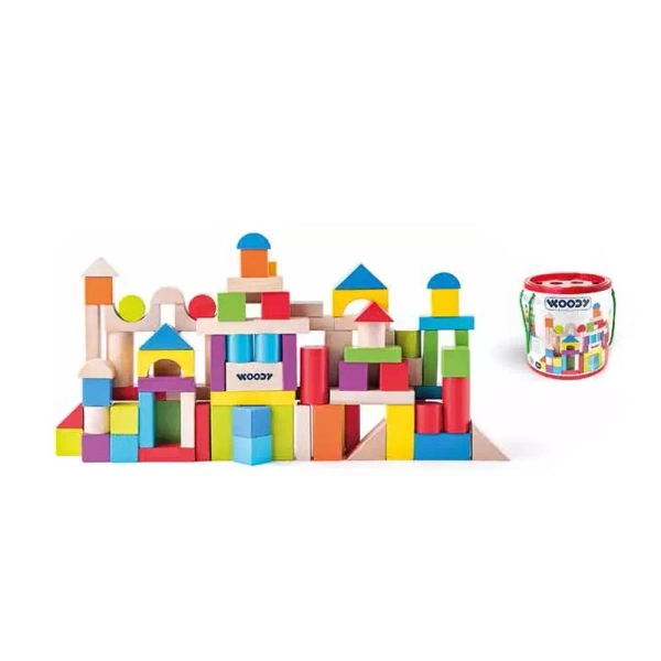 Klocki drewniane kolorowe i naturalne w wiaderku z pokrywką do sortowania kształtów 100 szt. 90905 Woody
