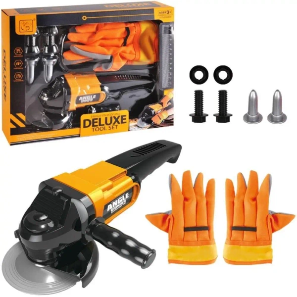 Realistyczna Kątówka: Głównym elementem zestawu jest duża, pomarańczowo-czarna kątówka (szlifierka kątowa) o realistycznym wyglądzie, bezpieczna dla dziecka.