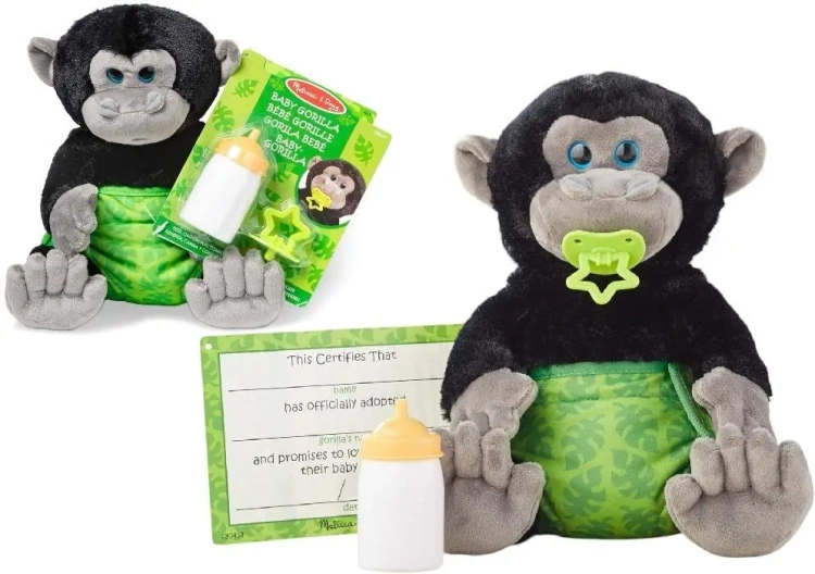 Maskotka Młody Goryl z certyfikatem adopcyjnym marki Melissa & Doug to uroczy pluszak, który rozwija empatię i opiekuńczość u najmłodszych. Miękka, przyjemna w dotyku zabawka posiada zdejmowaną pieluszkę, butelkę do karmienia oraz smoczek w kształcie gwiazdki, który idealnie pasuje do pyszczka gorylka. Dodatkowo zestaw zawiera imienny certyfikat adopcyjny, dzięki któremu dziecko może symbolicznie zaadoptować swojego nowego przyjaciela. To doskonały prezent edukacyjny, który łączy zabawę z nauką troski i odpowiedzialności.