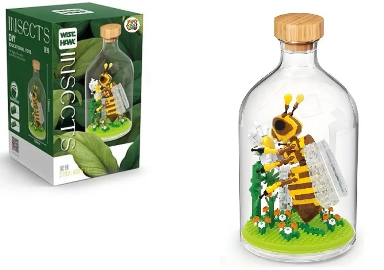 Zestaw Wise Hawk Insects Owad w butelce (No.1) to wyjątkowa propozycja dla miłośników klocków, przyrody i oryginalnego designu. Model przedstawia pszczółkę unoszącą się nad kwiatami, zamkniętą w przezroczystej butelce z tworzywa sztucznego, zakończonej korkiem imitującym drewno. Całość tworzy efekt eksponatu przyrodniczego, który zachwyca detalami i precyzją wykonania.
