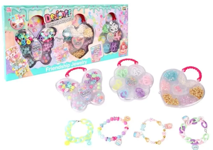 Zawartość zestawu: trzy pudełka w kształcie serca, kwiatu i motyla, koraliki w pastelowych i metalicznych kolorach, zawieszki dekoracyjne, elastyczne żyłki i przykładowe elementy do tworzenia kilku bransoletek