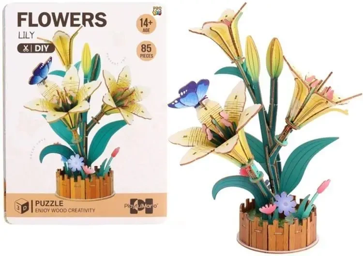Drewniane Puzzle 3D Kwiaty Lilie z serii Wooden Art to wyjątkowy zestaw kreatywny, który łączy elegancję natury z precyzją rękodzieła. Po złożeniu powstaje zachwycająca kompozycja kwiatów lilii o smukłych, kremowo-żółtych płatkach i zielonych liściach, ozdobiona delikatnymi detalami kolorowymi kwiatkami i niebieskim motylem. Całość umieszczona jest w stylowej, brązowej podstawie przypominającej drewniany płotek.