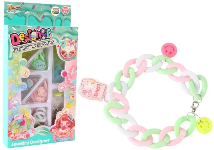 Zestaw Akademia Mody Designer NO.5 to kreatywna zabawka dla dzieci, które uwielbiają tworzyć kolorowe dodatki według własnego pomysłu. W komplecie znajdują się duże pastelowe ogniwa, zawieszki w kształcie uroczych postaci i słodkich symboli oraz elementy do łączenia i mocowania. Dzięki nim dziecko może samodzielnie wykonać efektowną bransoletkę o łańcuchowej strukturze, ozdobioną przywieszkami i kolorowymi detalami.