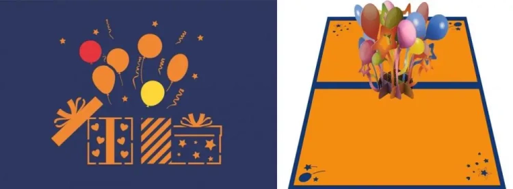 Po otwarciu karnetu oczom ukazuje się efektowne, trójwymiarowe balony. Precyzyjne cięcia papieru tworzą zachwycający efekt POP-UP, który dodaje kompozycji wyjątkowej głębi i elegancji.