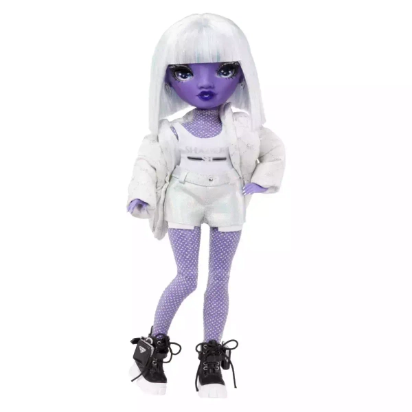 Modna lalka Dia Mante ma fioletową skórę i lśniące srebrno-białe włosy z grzywką. Niebieskie oczy podkreśliła wyrazistą czarną kreską zrobioną eyelinerem i rozświetlającym srebrnym cieniem do powiek. Na usta nałożyła ciemną, fioletową pomadkę z połyskiem.