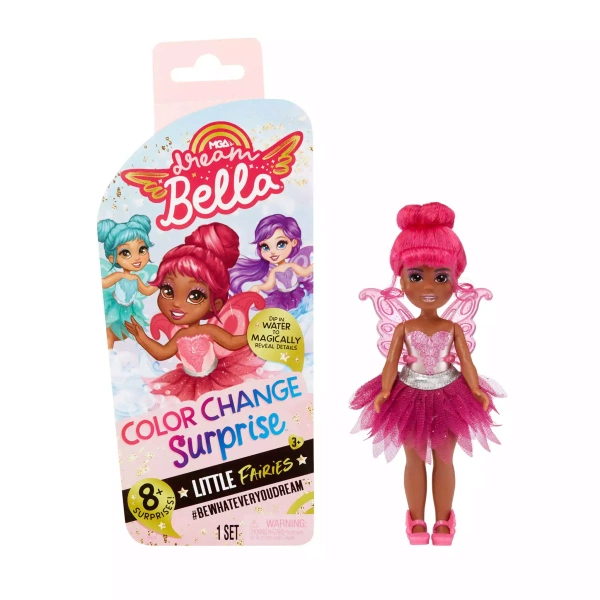 Lalki Dream Bella Color Change Surprise Fairies firmy MGA zapewniają pełne niespodzianek doświadczenie podczas rozpakowywania! W każdym opakowaniu znajduje się lalka do przebierania, ale wygląd każdej z nich pozostaje tajemnicą, dopóki nie zostanie odkryty poprzez zabawę w zmianę kolorów. Następnie dziewczynki odkryją uroczą lalkę z peruką, skrzydełkami, bucikami i spódniczkami.