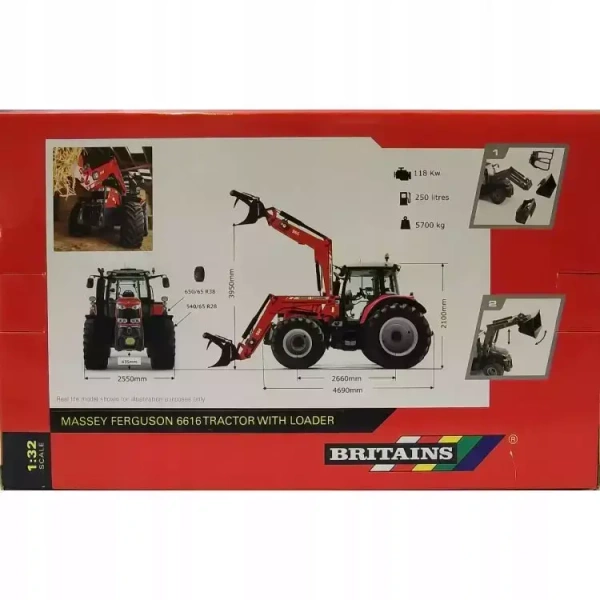 Modele firmy Britains to bardzo szczegółowo odwzorowane maszyny i pojazdy. Wykonane są z wysokiej jakości tworzywa, metalu oraz gumy. Ruchome elementy dodają realizmu. Ciągnik Britains Massey Feguson 6616 to autentyczna replika wykonana w skali 1:32. To niezwykle szczegółowo wykonany pojazd z widocznym układem hydraulicznym, który podnosi i opuszcza ładowacz czołowy oraz przechyla łyżkę. Posiada również duże opony z bieżnikiem oraz działającą kierownicą. Hak holowniczy jest kompatybilny z innymi autentycznymi replikami narzędzi i maszyn w skali 1:32. Wykonano go z odlewanego ciśnieniowo metalu i precyzyjnie formowanego, wytrzymałego tworzywa sztucznego. Nadaje się do zabawy w domu i na zewnątrz, dla dzieci i kolekcjonerów w wieku od 3 lat. Zabawki Britains pobudzają wyobraźnię dziecka pozwalając w bezpieczny i przyjemny sposób poznawać świat.
