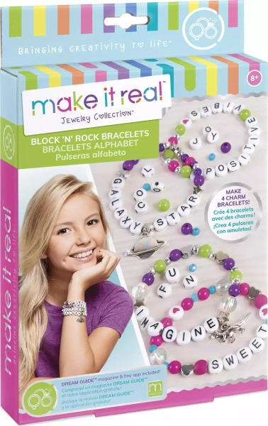 Początkujący projektanci bransoletek mogą zacząć od tego zestawu bransoletek DIY Block 'N' Rock firmy Make It Real. Zrób cztery modne bransoletki, którymi wyrazisz cokolwiek zechcesz, używając koralików z literami alfabetu.