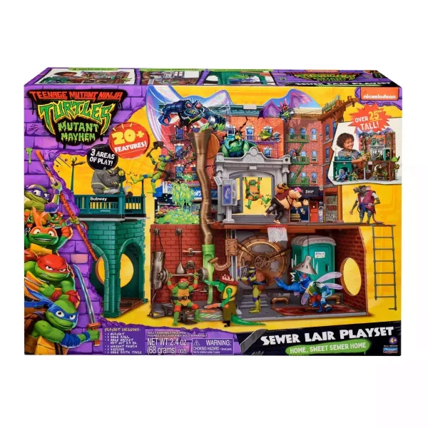 JAK Z FILMU: Zupełnie jak w przebojowym filmie ?Wojownicze Żółwie Ninja: zmutowany chaos?, zestaw do zabawy Kwatera w kanałach ma ponad 20 różnych funkcji i elementów, dzięki którym Żółwie są w doskonałej formie i zawsze gotowe do akcji.