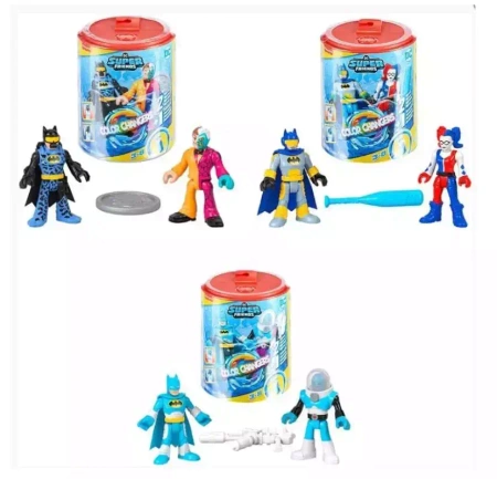 Pełne akcji przygody w Gotham nabierają nowych barw dzięki tym zestawom Imaginext DC Super Friends Color Changers z figurkami zmieniającymi kolor od Fisher-Price. W każdym zestawie znajdują się 2 figurki do ustawiania w r oacute żnych pozach zmieniające kolor po zanurzeniu w wodzie. Napełnij dołączony pojemnik ciepłą lub zimną wodą i zanurz w nim figurki, aby odsłonić inne kolory. Możesz zebrać je wszystkie. Zestawy sprzedawane oddzielnie, zależnie od dostępności . Kolory i elementy dekoracyjne mogą się r oacute żnić.