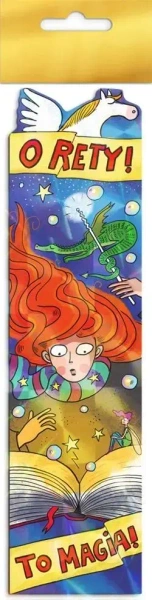 Zakładka do książki wykonana z grubego kartonu, ozdobiona lakierem soczewkowym.