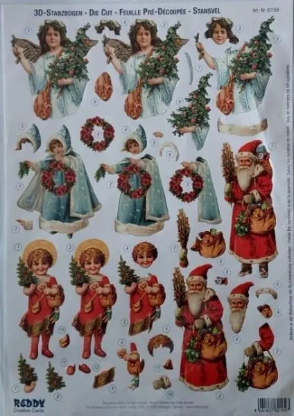 Arkusz do techniki 3 D z wysztancowanymi elementami . Format A-4, nie wymagające wycinania. Oznaczenia cyfrowe pomagają w perfekcyjnym nakładaniu elementów na siebie celem tworzenia wypukłych kompozycji.