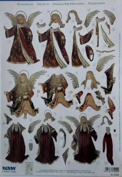 Arkusz do techniki 3 D z wysztancowanymi elementami . Format A-4, nie wymagające wycinania. Oznaczenia cyfrowe pomagają w perfekcyjnym nakładaniu elementów na siebie celem tworzenia wypukłych kompozycji.