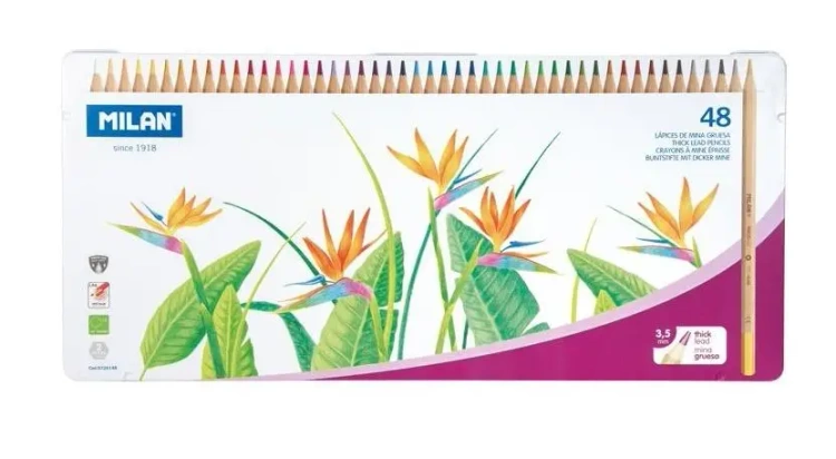 Drewno jest wytrzymałe i miękkie umożliwiając łatwe temperowanie. Wysokiej jakości pigmenty w żywych, intensywnych kolorach są odporne na działanie światła. Kreska wykonana kredką MILAN jest miękka, jednolita o wyraźnym odcieniu. Nie tworzy rowków ani nie niszczy papieru. Drewno pochodzi ze zrównoważonych plantacji. Każda kredka ma nadrukowaną nazwę koloru po angielsku. Kredki MILAN są zgodne z europejskimi i amerykańskimi normami bezpieczeństwa. Nie zawierają ftalanów, metali ciężkich i innych substancji toksycznych. Są bezpieczne dla dzieci.