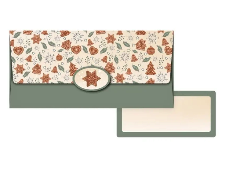 Koperta podarunkowa. Wewnątrz znajduje się ozdobna karteczka, na której można napisać życzenia. Każda koperta jest zapakowana osobno w folię z zawieszką euro.