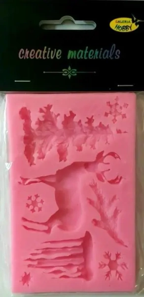 Forma silikonowa wielkości 7 cm x 11 cm do odlewów z gipsu, mas plastycznych, plasteliny, modeliny, mas cukierniczych itp.Z formy jest możliwość odlania lub stworzenia 8 elementów związanych z zimą i świętami - w tym dużych takich jak jeleń i choinka.