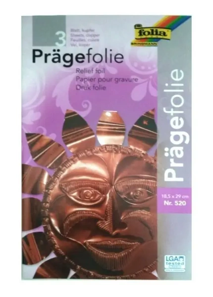 Folia metaliczna twarda, 18,5x29 cm - specjalna gruba folia aluminiowa barwiona w metaliczne kolory grubości wynoszącej 70 mikronów do tłoczeń i wykonywania tłoczonych płaskorzeźb, w teczkach miedziana a 3 ark