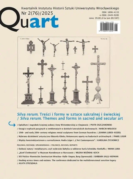 Prezentowany numer "Quarta" rozpoczyna tekst Piotra Oszczanowskiego, który rekonstruuje wygląd pomnika nagrobnego księżnej Anny Wirtemberskiej w Chojnowie. Marcin Wisłocki przedstawia zagadnienie tematyki pasyjnej w emblematycznych ujęciach luterańskich. Joanna Lubos-Kozieł prześledziła zjawisko produkcji detali wyobrażających podstawową ikonografię katolicką, odlewanych w tanim żelazie bądź cynku. Inny aspekt sztuki sakralnej przełomu XIX i XX w. ukazał Paweł Lisoń na przykładzie malarskiej twórczości Eduarda Klinka. Karolina Zychowicz próbuje wydobyć z zapomnienia Nadię Lger, przyjmując za punkt wyjścia wydawane przez artystkę międzynarodowe pismo "L'Art Contemporain - Sztuka Współczesna". W sekcji z recenzjami i relacjami proponujemy krytyczne przybliżenie książki Elżbiety Kal o malarstwie Karla Schmidta-Rottluffa, pióra Iwony Luby, spojrzenie Mileny Woźniak-Koch na wystawę Józefa Chełmońskiego oraz dwa sprawozdania - z seminarium terenowego Wrocław-Halle-Siegen (Barbara Salij-Hofman) oraz z międzynarodowej konferencji poświęconej trudnemu dziedzictwu kolekcji muzealniczych (Agata Strządała).