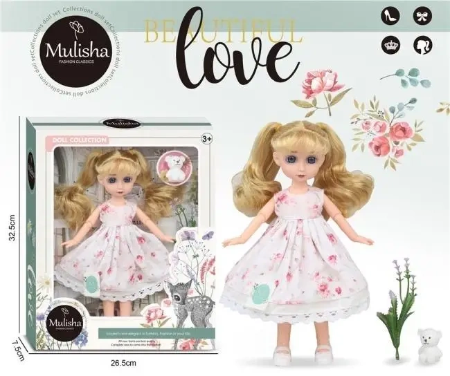 Przenieś się do świata elegancji i stylu dzięki wyjątkowej lalce z serii Mulisha Fashion Classics. Ta starannie wykonana zabawka zachwyca dbałością o detale i wysoką jakością wykonania. Lalka posiada lśniące blond włosy, które można czesać i stylizować, oraz wyraziste niebieskie oczy, które nadają jej przyjaznego wyrazu. Jej kreacja to zwiewna, biała sukienka ozdobiona delikatnym wzorem w różowe różyczki, co idealnie wpisuje się w wiosenny i romantyczny klimat kolekcji Beautiful Love. W zestawie znajduje się również uroczy dodatek w postaci małego, białego misia, który będzie wiernym towarzyszem podczas każdej zabawy. Produkt zapakowany jest w duże, ozdobne pudełko z okienkiem, udekorowane grafikami kwiatów, motyli oraz sarenki, dzięki czemu lalka prezentuje się niezwykle efektownie i nie wymaga dodatkowego pakowania na prezent.