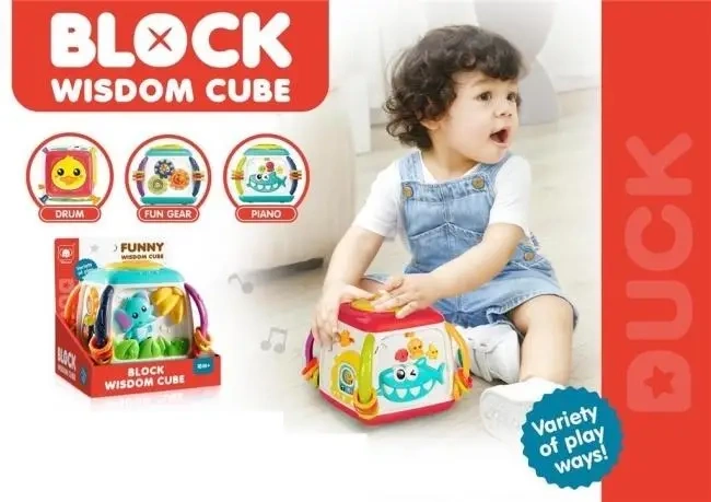Odkryj magię nauki poprzez zabawę z interaktywną kostką edukacyjną BLOCK WISDOM CUBE. Ta wielofunkcyjna zabawka została zaprojektowana, aby stymulować rozwój Twojego dziecka już od najmłodszych lat. Jedna ze ścianek kostki pełni funkcję bębenka z motywem kaczki, wydając wesołe dźwięki przy uderzeniu. Inny bok to zestaw kolorowych przekładni funkcyjnych, które zachęcają do manipulowania i rozumienia związku przyczynowo-skutkowego. Trzecia strona to pianinko z przyciskami i wizerunkiem rekina, które wprowadza dziecko w świat muzyki i kolorów. Dodatkowo, kostka zawiera elementy do wkładania kształtów i inne interaktywne detale, takie jak słonik, oferując różnorodne sposoby na rozwijanie zręczności, koordynacji ręka-oko i zdolności poznawczych. Wykonana z bezpiecznych materiałów, ta kolorowa kostka zapewnia wiele godzin angażującej i rozwijającej zabawy. Jest to doskonały wybór dla rodziców szukających zabawki, która rośnie razem z dzieckiem i oferuje różnorodność aktywności.