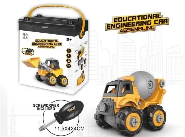 Głównym elementem zestawu jest model samochodu budowlanego typu betoniarka, który dziecko może całkowicie rozebrać i ponownie złożyć. Dzięki temu maluchy uczą się identyfikować poszczególne części maszyny, takie jak koła, bęben mieszający, śruby i podwozie, a także rozumieć, jak współpracują one ze sobą, tworząc funkcjonalną całość.