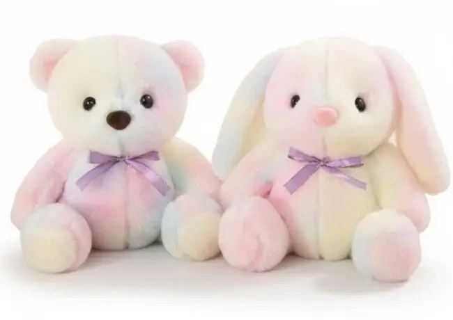 Przedstawiamy urocze pluszowe maskotki w pastelowych, tęczowych odcieniach, które rozświetlą każdy dzień. Do wyboru jest klasyczny miś lub słodki zajączek z długimi uszami. Każda przytulanka wykonana została z wyjątkowo miękkiego i puszystego pluszu, który jest niezwykle przyjemny w dotyku i zachęca do tulenia. Kolorystyka to delikatne połączenie różu, błękitu i żółci, tworzące subtelny efekt tęczy. Dodatkowego uroku dodaje satynowa fioletowa kokardka zawiązana pod szyją. Maskotki są bezpieczne dla dzieci i będą doskonałym towarzyszem zabaw, snu oraz piękną ozdobą dziecięcego pokoju. Idealne na prezent z okazji narodzin, urodzin lub Dnia Dziecka. Cena dotyczy zakupu jednej maskotki.