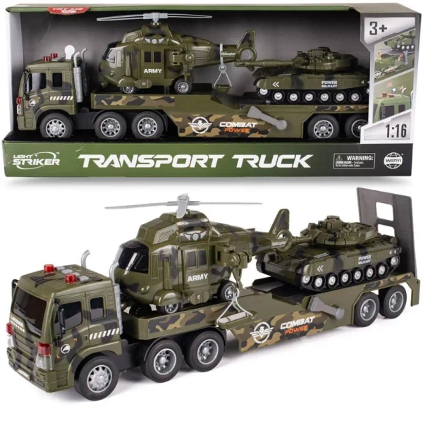 W zestawie znajduje się ciężarówka z charakterystycznymi dźwiękami, takimi jak uruchamianie silnika, sygnał dźwiękowy i dźwięk cofania. Długa rampa pozwala na łatwe załadowanie wszystkich pojazdów dołączonych do zestawu. Czołg oraz helikopter może z niej bez problemu zjechać, co rozwija zdolności manualne i wyobraźnię dziecka.