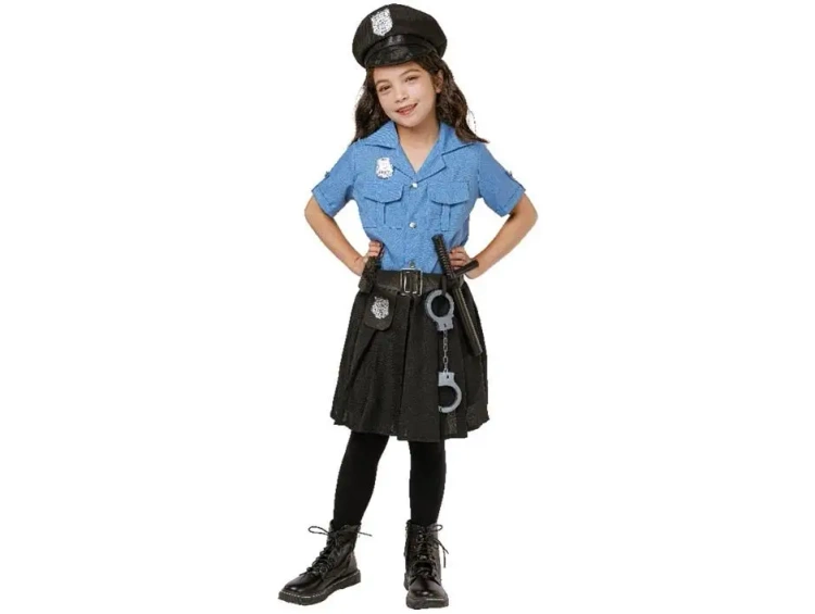 Strój Policjantka: Kapelusz, koszula, spódnica, pas, pałka, Walkie-Talkie, kajdanki
