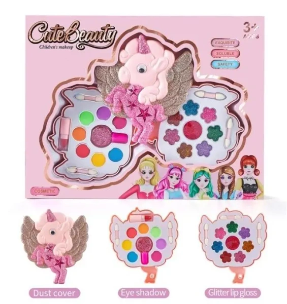 Głównym elementem zestawu jest uroczy jednorożec ze lśniącymi, brokatowymi skrzydłami, który służy jako efektowna osłona (Dust cover) na jedną z paletek. Wewnątrz dziewczynki znajdą dwie palety kosmetyków. Pierwsza paleta (Eye shadow) zawiera zestaw kolorowych cieni do powiek i pędzelek, idealny do tworzenia kreatywnych stylizacji. Druga paleta (Glitter lip gloss) kryje brokatowe błyszczyki do ust w różnych kolorach, które nadają ustom piękny, lśniący wygląd. W zestawie znajduje się także aplikator do błyszczyka.