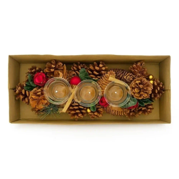 Elegancki stroik na Boże Narodzenie, o długości około 25-30cm. Nadaje się do położenia na świątecznym stole lub oknie. Naczynia w środku pozwalają na umieszczenie w nich trzech świec.