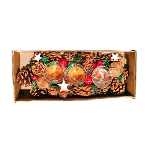 Elegancki stroik na Boże Narodzenie, o długości około 25-30cm. Nadaje się do położenia na świątecznym stole lub oknie. Naczynia w środku pozwalają na umieszczenie w nich trzech świec.