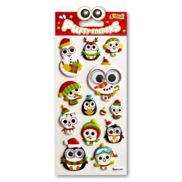 Wypukłe naklejki z serii Puffy stickers Google Eyes o zróżnicowanej ilości sztuk na arkuszu, postacie zmają charakterystyczne, wyłupiaste oczy. Do zdobień na kartkach okolicznościowych, pocztówkach, pudełkach na prezenty, torbach prezentowych, do dekoracji domu. Łatwo usuwalne . Format 9x20,5 cm.