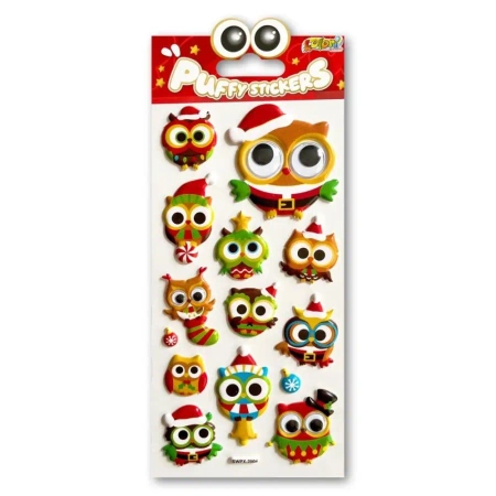 Wypukłe naklejki z serii Puffy stickers Google Eyes o zróżnicowanej ilości sztuk na arkuszu, postacie zmają charakterystyczne, wyłupiaste oczy. Do zdobień na kartkach okolicznościowych, pocztówkach, pudełkach na prezenty, torbach prezentowych, do dekoracji domu. Łatwo usuwalne . Format 9x20,5 cm.