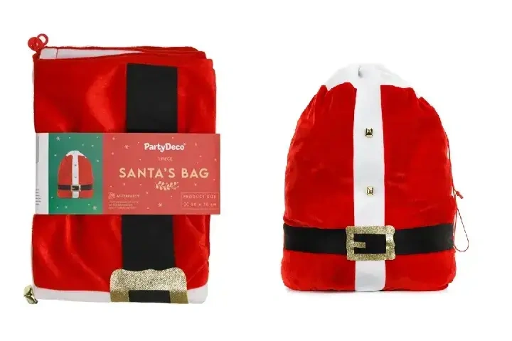 Worek na prezenty Świętego Mikołaja wykonany z miękkiego materiału w klasycznych świątecznych barwach czerwieni, bieli i czerni, z ozdobnym złotym paskiem. Idealnie sprawdzi się do przechowywania i wręczania prezentów w czasie świąt. Wymiary worka to ok. 50 x 70 cm, co pozwala pomieścić nawet większe upominki. Produkt wielokrotnego użytku, doskonały jako element dekoracyjny pod choinkę.