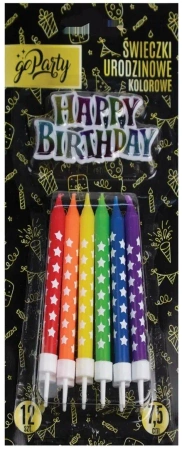 Kolorowe świeczki urodzinowe z nadrukiem w gwiazdki (wys. 7,5 cm) z praktycznym pikerem do łatwego umieszczenia w torcie