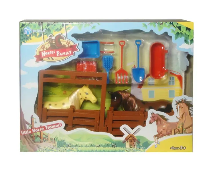 2 figurki koników w zagrodzie wraz z akcesoriami. M.in.: poidło, siano, taczka, szczotka, łopata.