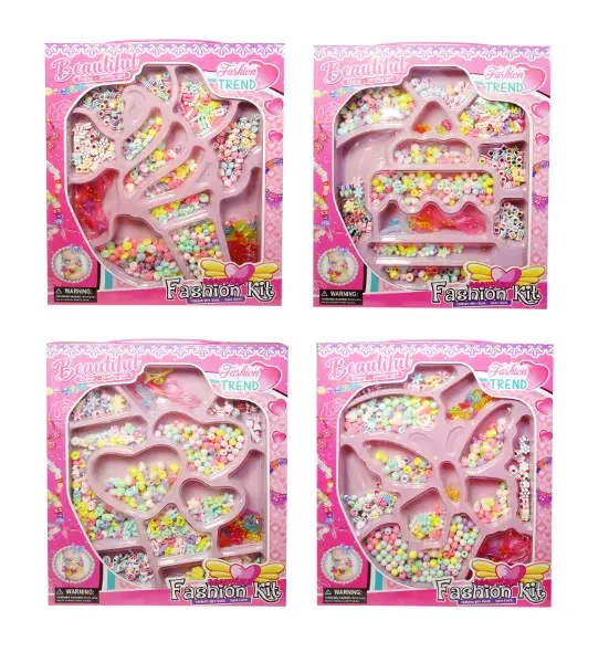 Kolorowe koraliki o różnej wielkości i kształcie (m.in. serduszka, literki, kwiatki i płatki śniegu) do tworzenia unikatowych bransoletek. Zapakowane w kartonowe opakowanie z przezroczystym okienkiem. Zabawka dla dzieci od 3 lat. Podane wymiary są wymiarami opakowania.