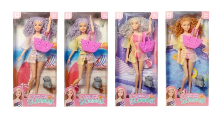 Lalka typu Barbie w kostiumie kąpielowym z narzutką. Lalka na głowie ma bushy włosy, a na ręce ma zawieszoną torebkę. Lalka posiada zginalne ręce i nogi. Do laleczki dołączono także zwierzątko - foczkę. Zestaw podbije serce niejednej dziewczynki. Produkt występuje w kilku wersjach kolorystycznych, wybierany losowo. Cena dotyczy jednej sztuki. Zabawka dla dzieci od 3 lat. Podane wymiary są wymiarami opakowania. Lalka zapakowana w kartonowe opakowanie z przezroczystym okienkiem.