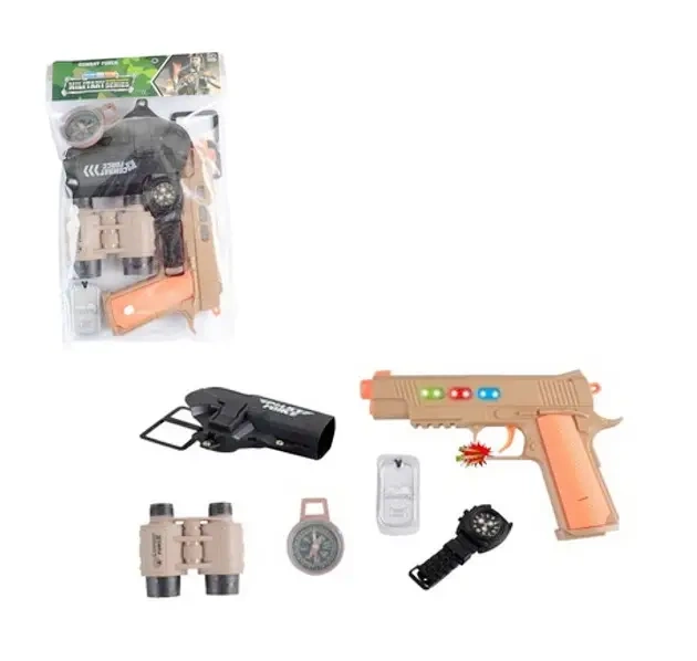 Zestaw wojskowy z pistoletem dla małego komandosa. W zestawie także m.in.: kompas, zegarek, lornetka. Ten zestaw wojskowy z pistoletem to doskonała propozycja dla dzieci, które uwielbiają zabawy w wojsko, akcję i przygodę. Produkt zapakowany w przzeroczysty worek.