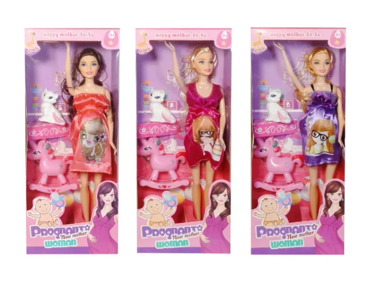 Lalka typu Barbie z ciążowym brzuszkiem i figurką kotka oraz konikiem na biegunach. Produkt występuje w kilku wersjach kolorystycznych, wybierany losowo. Cena dotyczy jednej sztuki. Zabawka zapakowana w kartonowe opakowanie. Podane wymiary są wymiarami opakowania.